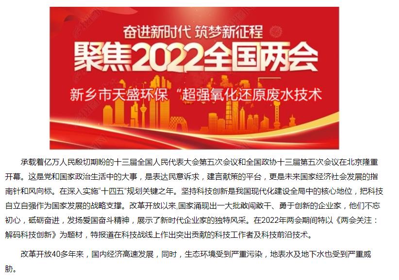 中國高新技術(shù)網(wǎng)發(fā)布:《關(guān)注:解碼科技創(chuàng)新》——新鄉(xiāng)市天盛環(huán)保“超強(qiáng)氧化還原廢水處理技術(shù)”